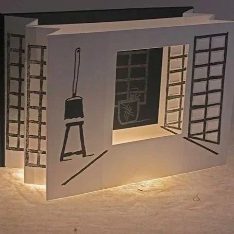Discover a paper theater made of layered panels with cut-outs held together by concertinas.